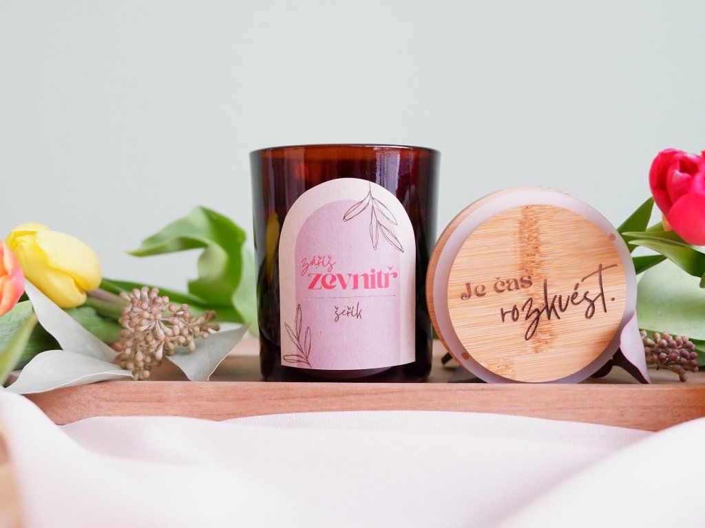 - Svíčka je ve sklenici s dřevěným vrškem.